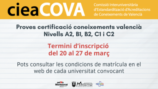 La Comissió Interuniversitària d’Estandardització d’Acreditacions de Coneixements de Valencià (CIEACOVA) ha publicat la convocatòria de les proves d’acreditació per al període de maig-juny de 2026. La podeu trobar en aquest enllaç: https://cieacova.com/
